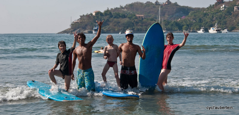 Cours de surf par Roberto de El Tunel Surf School à Casa Loma Bonita, un mexicain très sympa, 500 M$ les 3 séances en individuel.