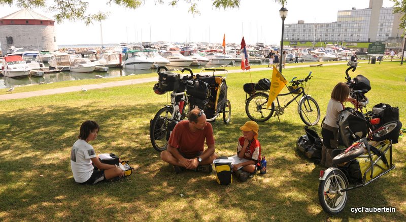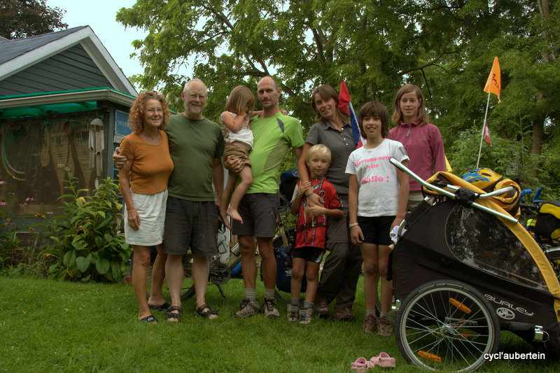 Nous avons aussi rencontré pas mal de monde durant ces jours, grâce notamment au réseau warmshowers. Il y a eu Rick et Kathy à Bloomfield et leur magasin de vélo incontournable, Gisèle et Georges à Long Sault où nous avons fait griller des Marshmallows autour de leur feu du soir, Bart et Judith, artiste qui nous ont accueillis dans leur maison et leur jardin très British. A Kingston, nous attendions la tombée de la nuit dans un parc pour planter la tente à la sauvette quand Greg est venu nous chercher pour nous installer dans son jardin et Cherry nous a préparé un petit déj canadien le lendemain. A Trenton nous étions attendus par Catherine, Maxime et Nicholas (Jean-Roch et Catherine ont un cousin en commun), reçus comme des rois, dormi dans des lits, mangé des céréales de toutes sortes, visité le musée de l’aviation, les petits se sont fait des copains.